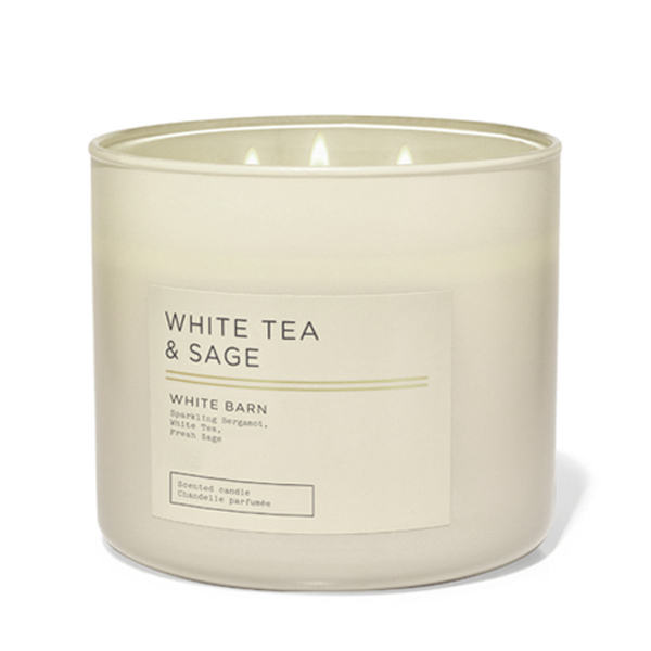 Nến Sáp Thơm Phòng White Tea & Sage cao cấp 3 tim - Bath and Body Works có hương nhẹ nhàng thư thái từ lá trà thảo mộc & cây xô thơm