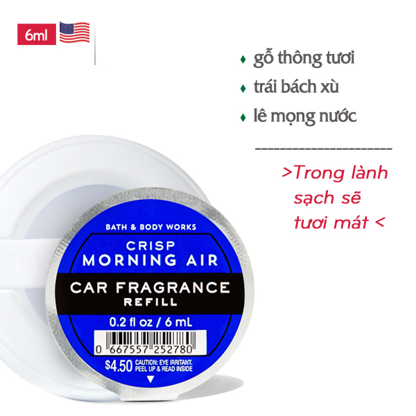 Nước Hoa Tinh Dầu Khử Mùi Làm Thơm Xe Hơi Ô tô mùi ngọt | Crisp Morning Air - Bath & Body Works an toàn và tiện lợi với hương thơm của thông tươi, cây bách xù và quả lê mọng nước - một hơi thở mát mẻ, ngọt ngào của không khí trong lành.