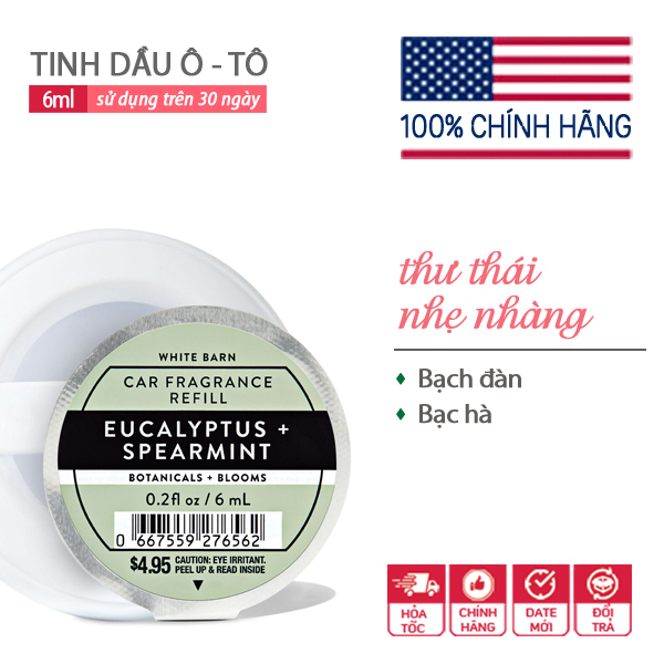 Nước Hoa Tinh Dầu Khử Mùi Làm Thơm Xe Hơi Ô tô mùi ngọt | Eucalyptus Spearmint - Bath & Body Works an toàn và tiện lợi với hương thơm dầu khuynh diệp và dầu bạc hà cho một ngày ở spa với những loại thảo dược tươi mát giúp bạn làm sạch, làm dịu và nâng cao tinh thần.