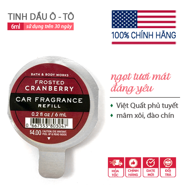 Nước Hoa Tinh Dầu Khử Mùi Làm Thơm Xe Hơi Ô tô mùi ngọt | Frosted Cranberry - Bath & Body Works an toàn và tiện lợi với mùi hương Việt Quất phủ tuyết the mát lạnh, có hậu ngọt ngào của quả mâm xôi chua ngọt và đào chín.