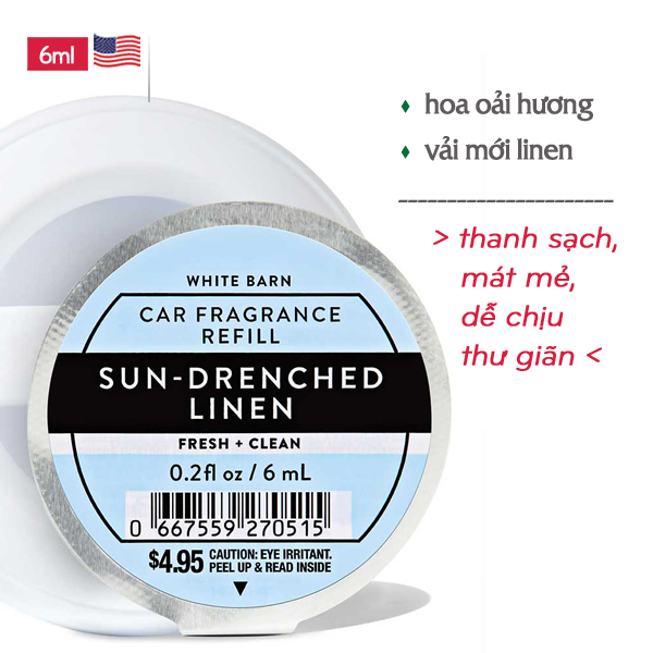 Nước Hoa Tinh Dầu Khử Mùi Làm Thơm Xe Hơi Ô tô mùi ngọt | Sun-Drenched Linen - Bath & Body Works an toàn và tiện lợi với hương thơm vải lanh tươi, táo chua giòn và xạ hương mềm mại mang cảm giác như đồ vừa giặt vào một ngày hè đầy nắng.