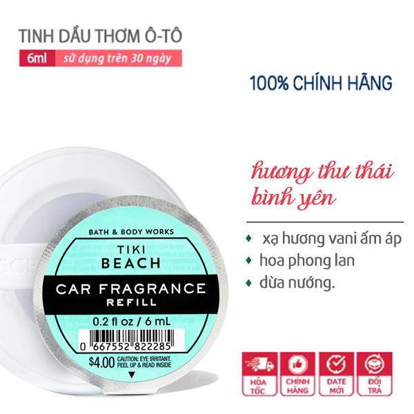Nước Hoa Tinh Dầu Khử Mùi Tiki Beach làm Thơm Xe Hơi Ô tô - Bath & Body Works an toàn và tiện lợi với hương thơm xạ hương vani, hoa lan và dừa nướng. Hương thơm gợi nhớ về những khoảnh khắc bình yên trên một bờ biển, vừa ấm áp, ngọt ngào, vừa lãng mạn, nhẹ nhàng, thư thái.