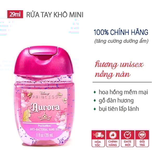 - Gel rửa tay khô dưỡng ẩm diệt khuẩn mini Aurora | Disney Princess - Bath & Body Works là dung dịch rửa tay không cần rửa lại với nước. Gel được chiết xuất từ thành phần tự nhiên với nhiều mùi hương đi cùng bộ sữa tắm, dưỡng thể, nước hoa xịt thơm toàn thân giữ cho mùi hương trên đôi tay của bạn thơm tho như mùi hương trên cơ thể bạn .