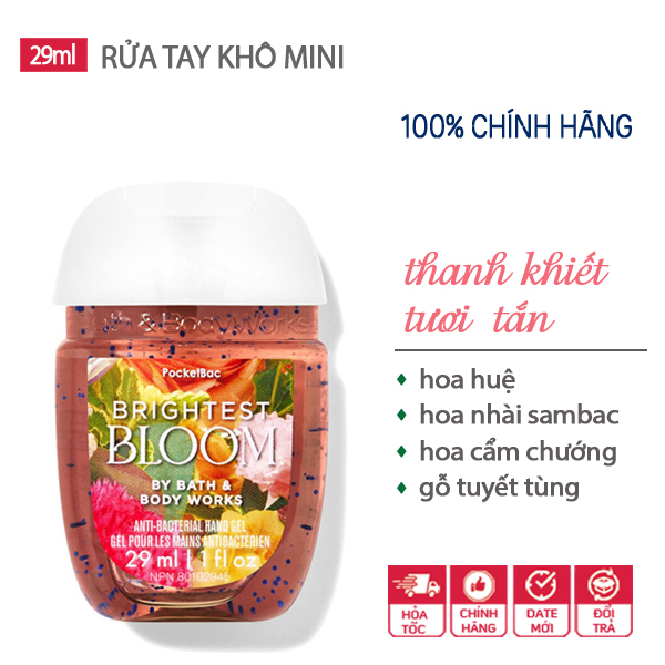 Gel rửa tay khô dưỡng ẩm diệt khuẩn mini dễ thương Brightest Bloom - Bath & Body Works là dung dịch rửa tay không cần rửa lại với nước thật tiện dụng cho các bạn hay đi ra ngoài hoặc đi du lịch mà không mang theo khăn giấy, không có nước rửa tay, hoặc sau khi ăn hải sản…