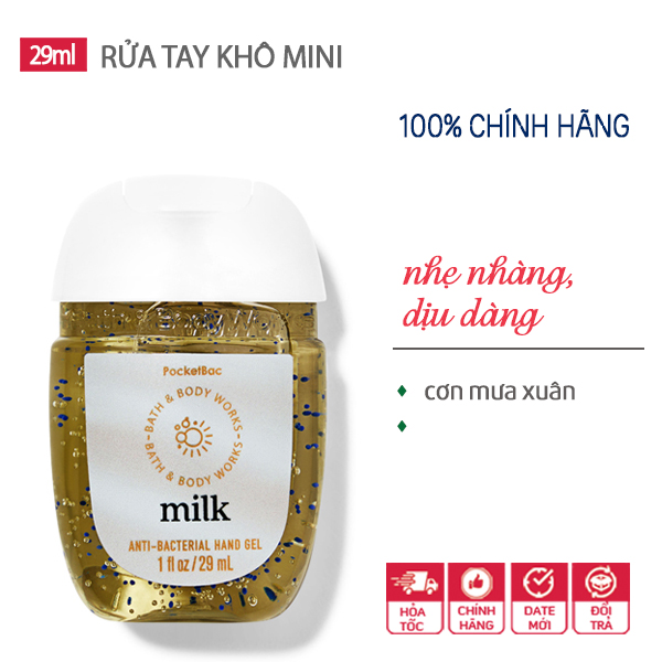 - Gel rửa tay khô dưỡng ẩm diệt khuẩn mini Milk - Bath & Body Works là dung dịch rửa tay không cần rửa lại với nước thật tiện dụng cho các bạn hay đi ra ngoài hoặc đi du lịch mà không mang theo khăn giấy, không có nước rửa tay, hoặc sau khi ăn hải sản…