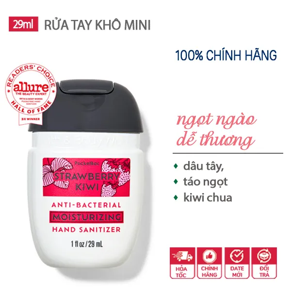 Gel rửa tay khô dưỡng ẩm diệt khuẩn mini hương Strawberry Kiwi (tăng thêm dưỡng) - Bath & Body Works là dung dịch rửa tay không cần rửa lại với nước thật tiện dụng cho các bạn hay đi ra ngoài hoặc đi du lịch mà không mang theo khăn giấy, không có nước rửa tay, hoặc sau khi ăn hải sản…