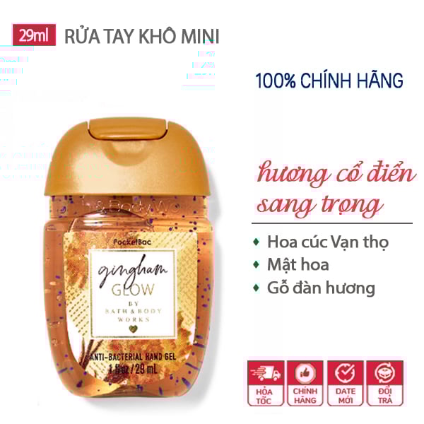 Gel rửa tay khô dưỡng ẩm diệt khuẩn mini dễ thương Gingham Glow - Bath & Body Works là dung dịch rửa tay không cần rửa lại với nước thật tiện dụng cho các bạn hay đi ra ngoài hoặc đi du lịch mà không mang theo khăn giấy, không có nước rửa tay, hoặc sau khi ăn hải sản…