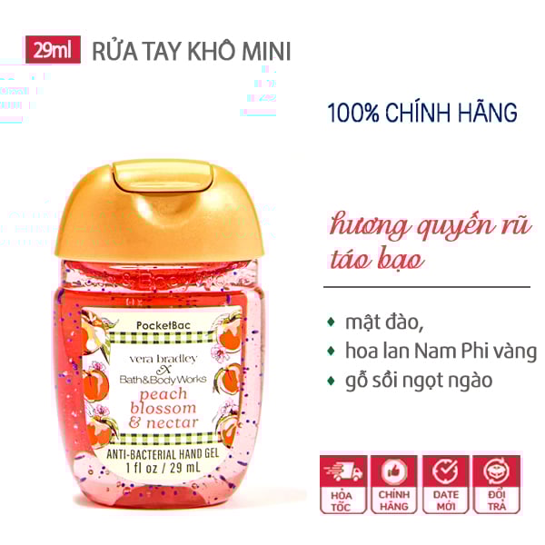 - Gel rửa tay khô dưỡng ẩm diệt khuẩn mini Peach Blossom & Nectar - Bath & Body Works là dung dịch rửa tay không cần rửa lại với nước. Gel được chiết xuất từ thành phần tự nhiên với nhiều mùi hương đi cùng bộ sữa tắm, dưỡng thể, nước hoa xịt thơm toàn thân giữ cho mùi hương trên đôi tay của bạn thơm tho như mùi hương trên cơ thể bạn .