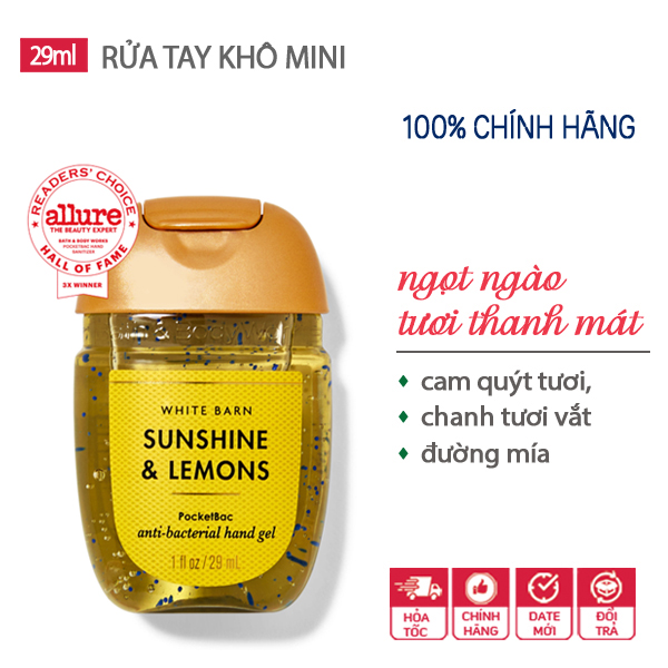 Gel rửa tay khô dưỡng ẩm diệt khuẩn mini thanh mát Sunshine & Lemons - Bath & Body Works là dung dịch rửa tay không cần rửa lại với nước thật tiện dụng cho các bạn hay đi ra ngoài hoặc đi du lịch mà không mang theo khăn giấy, không có nước rửa tay, hoặc sau khi ăn hải sản…