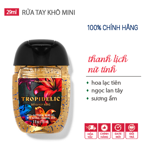 Gel rửa tay khô dưỡng ẩm diệt khuẩn mini thanh mát Tropidelic - Bath & Body Works là dung dịch rửa tay không cần rửa lại với nước thật tiện dụng cho các bạn hay đi ra ngoài hoặc đi du lịch mà không mang theo khăn giấy, không có nước rửa tay, hoặc sau khi ăn hải sản…