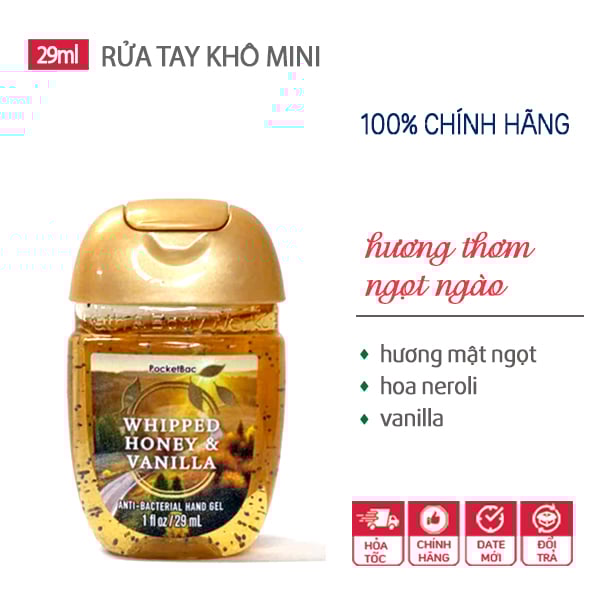 Gel rửa tay khô dưỡng ẩm diệt khuẩn mini Whipped Honey & Vanilla - Bath & Body Works là dung dịch rửa tay không cần rửa lại với nước thật tiện dụng cho các bạn hay đi ra ngoài hoặc đi du lịch mà không mang theo khăn giấy, không có nước rửa tay, hoặc sau khi ăn hải sản…