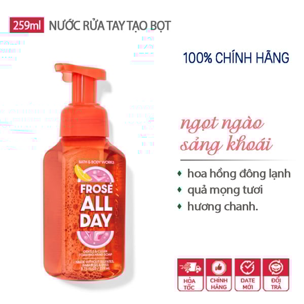 Nước xà phòng rửa tay tạo bọt Frosé All Day - Bath and Body Works được đặc chế với công thức cải tiến vừa để làm sạch, diệt khuẩn mạnh mẽ và khử mùi hiệu quả. Hàng chính hãng từ Mỹ.