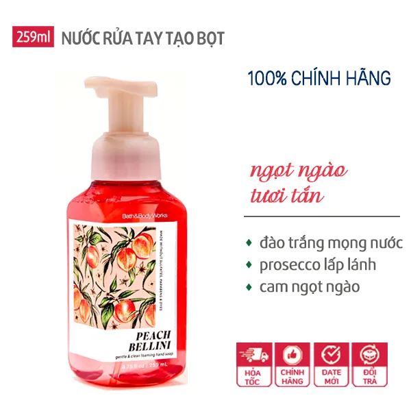 Nước xà phòng rửa tay tạo bọt Peach Bellini - Bath and Body Works được đặc chế với công thức cải tiến vừa để làm sạch, diệt khuẩn mạnh mẽ và khử mùi hiệu quả. Hàng chính hãng từ Mỹ.