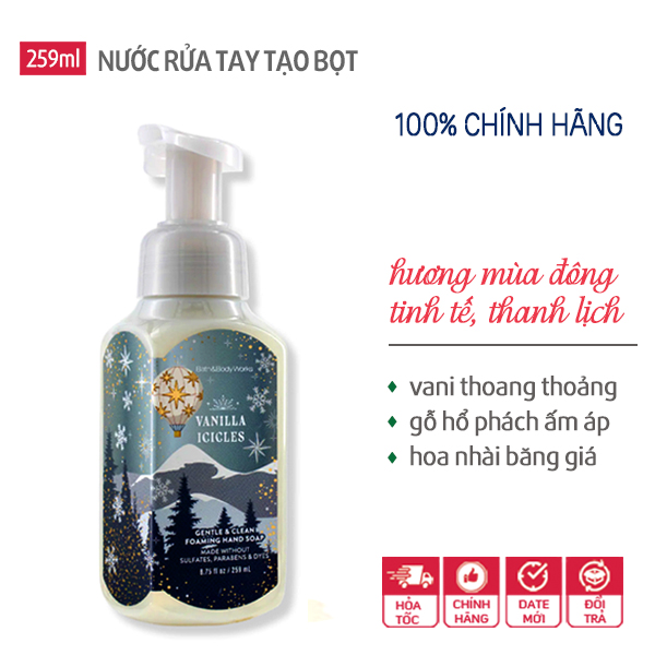 Nước xà phòng rửa tay tạo bọt Vanilla Icicles - Bath and Body Works được đặc chế với công thức cải tiến vừa để làm sạch, diệt khuẩn mạnh mẽ và khử mùi hiệu quả. Hàng chính hãng từ Mỹ.