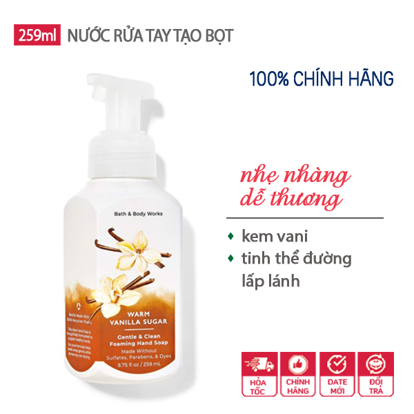 Nước xà phòng rửa tay tạo bọt Warm Vanilla Sugar - Bath and Body Works được đặc chế với công thức cải tiến vừa để làm sạch, diệt khuẩn mạnh mẽ và khử mùi hiệu quả, đặt biệt lưu hương ngọt ngào dễ thương. Hàng chính hãng từ Mỹ.