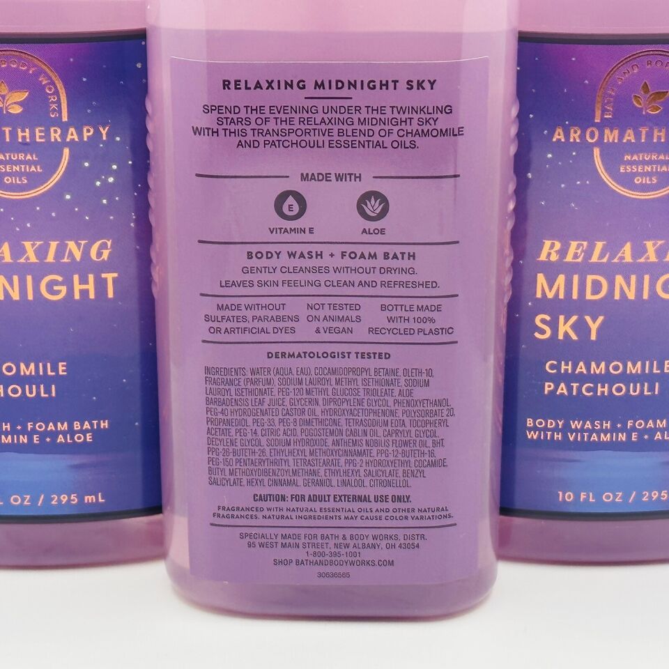 ** Mùi hương: Sữa tắm hương spa thư giãn Relaxing Midnight Sky | CHAMOMILE PATCHOULI - Bath & Body Works chiết xuất mùi hương từ tinh dầu hoa cúc & hoắc hương. Hương thơm thật sự toát lên 1 bầu trời thư thái lúc nửa đêm giúp thư giãn cải thiện giấc ngủ sâu hơn.