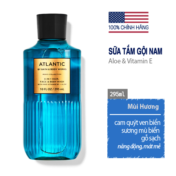 Sữa tắm gội & rửa mặt Atlantic 3in1 cho nam - Bath and Body Works là một sự pha trộn mạnh mẽ nhưng sang trọng của các thành phần tốt nhất thế giới dành cho nam giới. TInh chất Lô hội kết hợp với Bơ hạt mỡ để nuôi dưỡng làn da mềm mịn, Vitamin E làm sạch & giữ ẩm cho cả da và tóc. Chất tạo bọt mềm mại mang lại trải nghiệm hương thơm tươi mát toàn diện giúp bạn cảm thấy thực sự thoải mái và thư giản. Công thức xả nhanh làm sạch da & tóc tiện lợi & nhanh nhất. Hãy thật sự trãi nghiệm sự tiện lợi và các tính năng vượt trội của sữa tắm gội nam Atlantic - Bath and Body Works không nhờn rít, không gây dị ứng, kích ứng da. Bạn hoàn toàn được đảm bảo an toàn & yên tâm với các vấn đề về da.