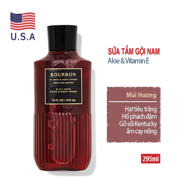 Sữa tắm gội rửa mặt cho nam giới mùi hương Bourbon vitamin E - Bath and Body Works là một sự pha trộn mạnh mẽ nhưng sang trọng của các thành phần tốt nhất thế giới dành cho nam giới. TInh chất Lô hội kết hợp với Bơ hạt mỡ để nuôi dưỡng làn da mềm mịn, Vitamin E làm sạch & giữ ẩm cho cả da và tóc. Chất tạo bọt mềm mại mang lại trải nghiệm hương thơm tươi mát toàn diện giúp bạn cảm thấy thực sự thoải mái và thư giản. Công thức xả nhanh làm sạch da & tóc tiện lợi & nhanh nhất. Hãy thật sự trãi nghiệm sự tiện lợi và các tính năng vượt trội của sữa tắm gội nam Bourbon - Bath and Body Works không nhờn rít, không gây dị ứng, kích ứng da. Bạn hoàn toàn được đảm bảo an toàn & yên tâm với các vấn đề về da.