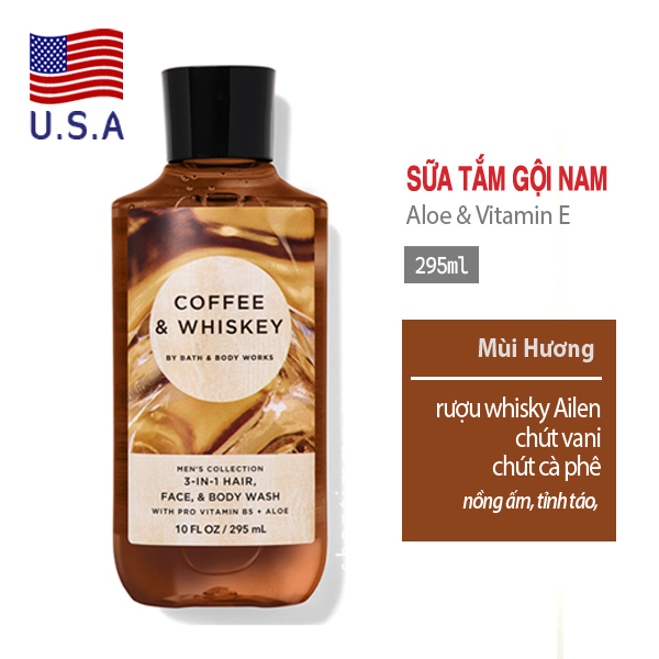 ++ Sữa tắm, gội đầu, rửa mặt 3 in 1 cho nam giới Coffee & Whiskey - Bath and Body Works có hương thơm là sự kết hợp của rịu whisky Ailen đậm đà, chút vani và chút cà phê.