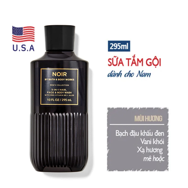 * Mùi hương: Sữa tắm gội nam Noir - Bath and Body Works mang đến một bầu không khí huyền bí với sự pha trộn kỳ lạ của thảo quả đen, vani khói và một chút xạ hương.