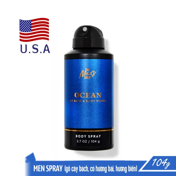 Xịt khử mùi toàn thân Ocean - Bath & Body Works cho nam với mùi hương biển mát lạnh, tươi trẻ và mạnh mẽ, kết hợp khử mùi mồ hôi. Sử dụng vào buổi sáng, sau khi tập thể dục hoặc để làm mới chính mình trong suốt cả ngày.