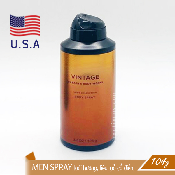 Xịt khử mùi toàn thân nam Vintage - Bath and Body Works mang hương thơm của sự hoài niệm, ấm áp từ hương hoa oải hương xanh, hạt tiêu tươi và gỗ cổ điển.